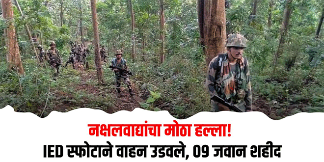 Naxalites attack again : Nine soldiers martyred विजापूर (6 जानेवारी 2025) : नक्षलवाद्यांनी आयडी स्फोट घडवत वाहन उडवल्याने या हल्ल्यात नऊ जवान शहीद झाले आहे. छत्तीसगडमधील विजापूर जिल्ह्यात सोमवारी रात्री सव्वादोन वाजता ऑपरेशनहून परतणार्या जवानांच्या वाहनाला टार्गेट करण्यात आले.