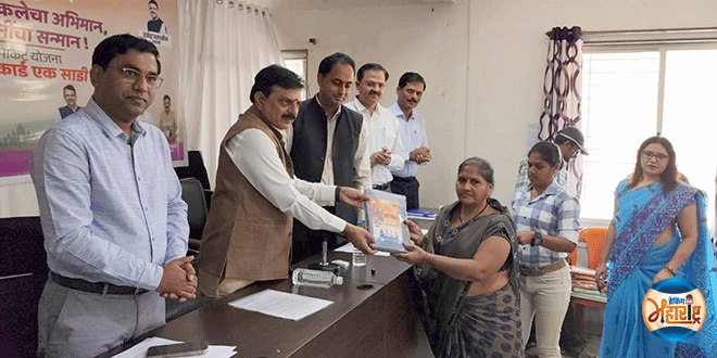 25 lakh Antyodaya ration card holders in the state will get free sarees from the cheap food shops भुसावळ (28 जानेवारी 2025) : राज्यातील 24 लाख 87 हजार 375 अंत्योदय शिधापत्रिका धारकांंना स्वस्त धान्य दुकानातून साडी वितरण होणार असून सहकारी यंत्रमाग संस्था व सूक्ष्म लघू व मध्यम उद्योग अंतर्गत नोंदणीकृत घटकाकडून साड्यांचे उत्पादन करण्यात आले आहे. या माध्यमातून विणकरांना रोजगार उपलब्ध झाल्याचा आशावाद वस्त्रोद्योग मंत्री संजय सावकारे यांनी येथे व्यक्त केला. कॅप्टीव्ह मार्केट योजने अंतर्गत ‘एक रेशन कार्ड, एक साडी’ या योजनेचा शुभारंभ भुसावळ प्रांत कार्यालयातील तापी सभागृहात सोमवार, 27 जानेवारी रोजी झाला. याप्रसंगी तालुक्यातील 10 अंत्योदय शिधापत्रिका धारकांना प्रातिनिधिक स्वरूपात मंत्री सावकारे यांच्याहस्ते साडी वितरण करण्यात आले.