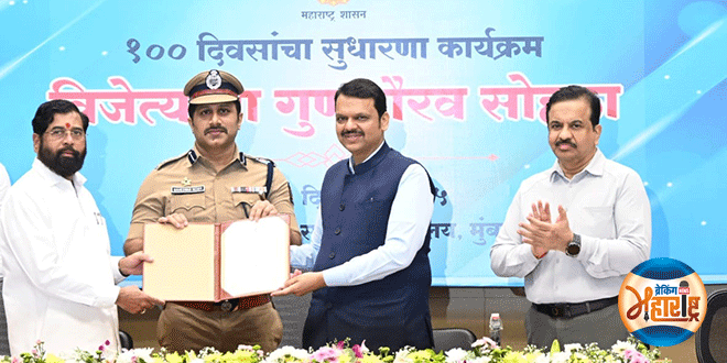 Jalgaon district ranks third in the state in office reforms ; District Collector and Superintendent of Police felicitated by the Chief Minister जळगाव (7 मे 2025) : राज्य शासनाच्या 100 दिवसांच्या विशेष कार्यालयीन सुधारणा मोहिमेत उल्लेखनीय कामगिरी बजावत जळगाव जिल्ह्याने राज्यात तिसरा क्रमांक पटकावला आहे. या यशाबद्दल जिल्हाधिकारी आयुष प्रसाद आणि जिल्हा पोलीस अधीक्षक डॉ. महेश्वर रेड्डी यांचा मंत्रालयात मुख्यमंत्री देवेंद्र फडणवीस आणि उपमुख्यमंत्री एकनाथ शिंदे यांच्या हस्ते गौरव करण्यात आला. याप्रसंगी राज्य मंत्रिमंडळातील मंत्री, जळगाव जिल्ह्याचे पालक सचिव तथा महसूल विभागाचे अपर मुख्य सचिव राजेशकुमार, प्रधान सचिव, सचिव, विविध विभागांचे वरिष्ठ अधिकारी उपस्थित होते.