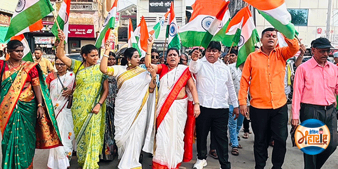 Shiv Sena takes out victorious tricolor rally in Bhusawal in honor of Operation Sindoor भुसावळ (23 मे 2025) : भारतीय सैन्याने पाकिस्तानविरोधात राबविलेल्या ऑपरेशन सिंदूर या दहशतवादविरोधी मोहिमेच्या सन्मानार्थ येथे शिवसेना (शिंदे गट)तर्फे विजयी तिरंगा रॅलीचे आयोजन केले होते. महिला जिल्हा प्रमुख नंदाताई प्रकाश निकम यांच्या नेतृत्वाखाली ही रॅली छत्रपती शिवाजी महाराज यांच्या पुतळ्यापासून दुपारी काढली होती.