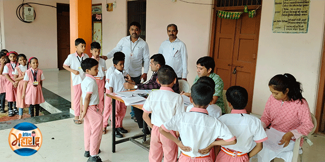 Health check-up of students at Mehta Vidyamandir in Bhusawal भुसावळ (9 जुलै 2025) : शहरातील श्री र.न.मेहता हिंदी प्राथमिक विद्यामंदिरात विद्यार्थ्यांची आरोग्य तपासणी करण्यात आली. ग्रामीण रुग्णालयाचे वैद्यकीय अधिकारी डॉ.सनी जैन, औषध निर्माण अधिकारी श्रीकांत भांडारकर, परिचारिका रोहिणी बोरसे, वैद्यकीय अधिकारी डॉ.वनश्री पालवे उपस्थित होत्या.