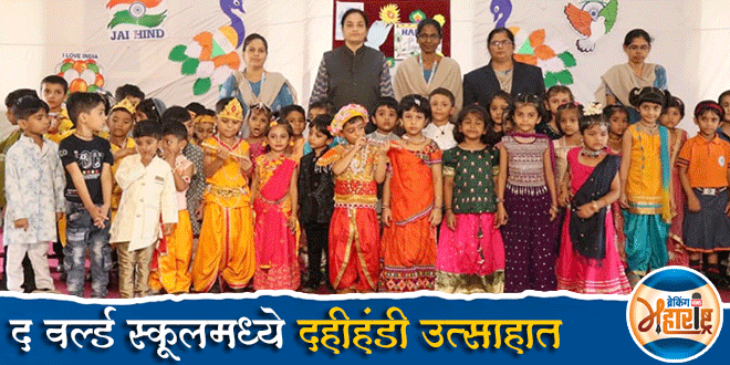 Dahi Handi is a celebration at The World School in Bhusawal भुसावळ (16 ऑगस्ट 2025)  शहरातील कोलते फाउंडेशन एज्युकेशनल इन्स्टिट्यूशन संचलित ‘द वर्ल्ड स्कूल’ भुसावळमध्ये श्रीकृष्ण जन्मानिमित्त शनिवारी दहीहंडी उत्सव उत्साहात साजरा करण्यात आला. शाळेतील प्री प्रायमरीच्या विद्यार्थ्यांनी कृष्णाच्या व राधेच्या विविध वेशभूषा साकारत विविध प्रकारच्या गाण्यांवर नृत्य सादर करीत लक्ष वेधले.