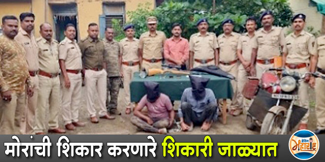 Major action by Yaval Forest Department : Poachers who hunted five peacocks caught in the net यावल (1 सप्टेंबर 2025) : यावल वनविभागाने गोपनीय माहितीद्वारे मोरांची शिकार करणार्या दोन शिकार्यांना अटक केली असून त्यांच्याकडून पाच मृत मोर, एअर रायफल, चाकू, टॉर्च व मोटरसायकल आदी साहित्य जप्त करण्यात आले. सलीम रुबाब तडवी व सय्यद अफसर अली मुशताक अली (दोघेही मारूळ, ता.यावल) अशी अटकेतील आरोपींची नावे असून दोघांनी गोळीबार केल्याचे स्वतः कबूल केले आहे. आरोपींना न्यायालयाने तीन दिवसांची वन कोठडी सुनावली.