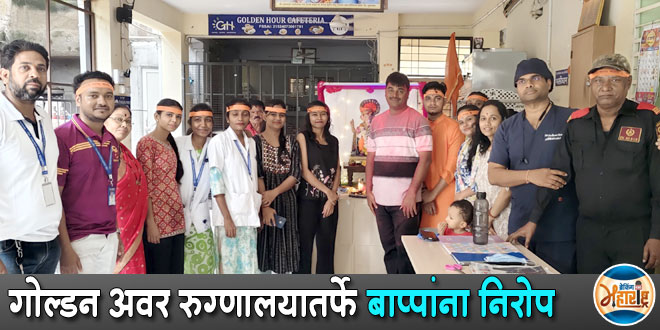 Saying goodbye, God, now it must be an order…! In the midst of a shower of flowers, Sasru bid farewell to Vighnaharta with tearful eyes at Golden Hour Hospital in Bhusawal. भुसावळ (6 सप्टेंबर 2025) : शहरातील आनंद नगरस्थित गोल्डन अवर रुग्णालयात मोठ्या भक्तीभावाने स्थापन करण्यात आलेल्या गणरायाला फुलांचा वर्षाव करीत साश्रू नयनांनी व पुढच्या वर्षी लवकर या ! च्या जयघोषात निरोप देण्यात आला.