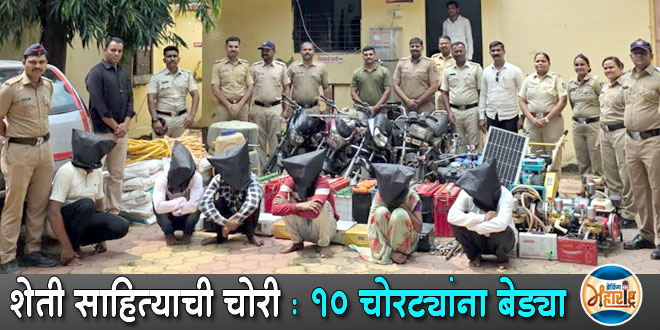 या आरोपींकडून शेतीचे साहित्य, 5 टी.पी. पंप, 11 मोठ्या बॅटर्या, 3 लहान बॅटर्या, 7 इन्व्हर्टर, 4 मोटारसायकल, 2 पॉवर ट्रॅक्टर, 1 नॅनो कार, 2 सोलार प्लेट, 11 मटेरियल बॅग आणि 3 ठिबक नळ्यांचे बंडल असा एकूण 12 लाख रुपयांचा मुद्देमाल हस्तगत करण्यात आला आहे. यामुळे निंभोरा, यावल, रावेर, मुक्ताईनगर आणि सावदा पोलीस स्टेशनमधील एकूण 10 गुन्हे उघडकीस आले आहेत.