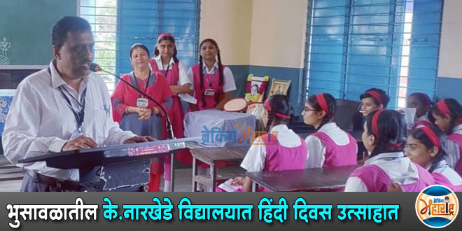 Hindi Day celebrated with enthusiasm at K. Narkhede Vidyalaya in Bhusawal भुसावळ (17 सप्टेंबर 2025) : भुसावळ शहरातील के.नारखेडे विद्यालयात ‘हिंदी दिवस’ उत्साहात साजरा करण्यात आला. याप्रसंगी विद्यालयाचे मुख्याध्यापक वाय.एन.झोपे व पर्यवेक्षक एस.पी.पाठक, बी.बी.जोगी, संगणक विभाग प्रमुख बी.ए.पाटील व्यासपीठावर उपस्थित होते.