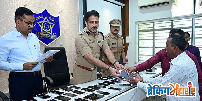 Jalgaon District Police returned mobile phones worth Rs 12.50 lakh to complainants जळगाव (19 ऑक्टोबर 2025) : गहाळ किंवा चोरीला गेलेले 62 मोबाईल शनिवारी जळगाव पोलिस अधीक्षक डॉक्टर महेश्वर रेड्डी यांच्याहस्ते मूळ तक्रारदारांना परत देण्यात आले. विशेष म्हणजे या मोबाईलचे मार्केट मूल्य तब्बल साडेबारा लाख रुपये आहे.