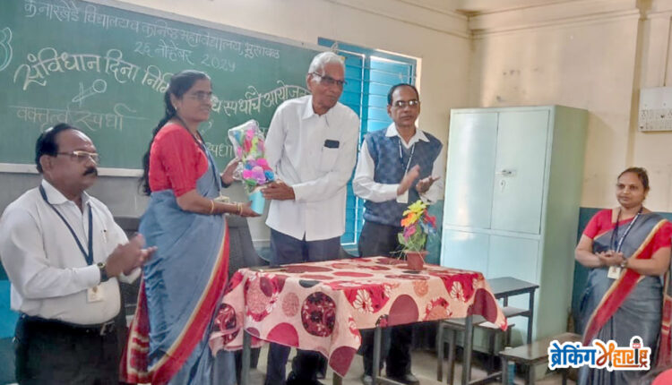 भुसावळ (29 नोव्हेंबर 2025) :  भुसावळ शहरातील के.नारखेडे विद्यालयात बुधवार, 26 रोजी संविधान दिनानिमित्त विद्यालयात विविध कार्यक्रम व स्पर्धांचे आयोजन करण्यात आले. विद्यालयाच्या प्रभारी मुख्याध्यापिका संगीता अडकमोल यांच्याहस्ते भारतरत्न डॉक्टर बाबासाहेब आंबेडकर यांच्या प्रतिमेस पुष्पहार अर्पण करून संविधान पूजन करण्यात आले.
