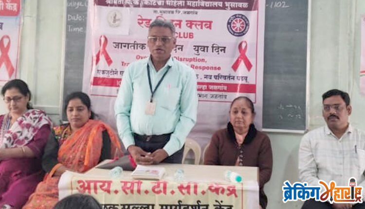 AIDS awareness week at P.K. Kotecha Women’s College in Bhusawal भुसावळ (15 डिसेंबर 2025) : शहरातील श्रीमती प.क.कोटेचा महिला महाविद्यालयात राष्ट्रीय सेवा योजना एककातर्फे रेड रिबीन क्लब अंतर्गत एड्स जनजागृती अभियान मोठ्या उत्साहात साजरा करण्यात आले. उद्घाटन महाविद्यालयाचे प्रभारी प्राचार्य डॉ.जीवन धांडे, वरणगाव ग्रामीण रुग्णालयाच्या समुपदेशिका ज्योती गुरव, भावना प्रजापती, रासेयो अधिकारी डॉ.मीना चौधरी, प्रा.एस.बी.नेतनराव, प्रा.निलेश गुरुचळ यांच्या उपस्थितीत करण्यात आले.