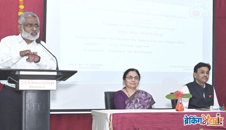 A workshop was held at D.N. Bhole College in Bhusawal on the topic of Budget 2026 भुसावळ (7 फेब्रुवारी 2026) : दि पीपल्स चॅरिटेबल संस्था संचालित दादासाहेब देविदास नामदेव भोळे महाविद्यालयातील अर्थशास्त्र व वाणिज्य विभागाने शुक्रवार, 6 रोजी अर्थसंकल्प 2026 या विषयावर कार्यशाळा आयोजित केली. अध्यक्षस्थानी महाविद्यालयाचे प्राचार्य डॉ.आर.पी.फालक होते. प्रमुख वक्ते म्हणून भुसावळ शहरातील प्रख्यात सीए मुकेश अग्रवाल होते.