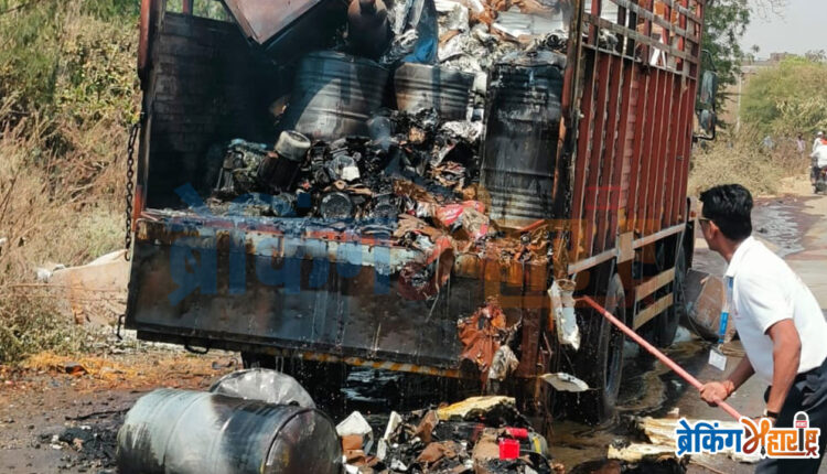 Eicher Truck Catches Fire Near Bhusawal : Loss of Life Averted Due to Driver’s Presence of Mind भुसावळ (13 मार्च 2026) : भुसावळ-जामनेर जाणार्‍या रस्त्यावर आयशर वाहनाला आग लागल्याची घटना शुक्रवारी सकाळी 11.15 वाजेच्या सुमारास घडली. आगीचे कारण अस्पष्ट असले तरी या आगीत वाहनातील साहित्य जळून नुकसान झाले तर चालकाने प्रसंगावधान राखत उडी मारल्याने प्राणहानी टळली. दरम्यान, या वाहनात ऑक्सीजन सिलिंडरसह सल्फ्यूरिक अ‍ॅसीड असल्याने स्फोट होण्याची शक्यता गृहीत धरून दोन्ही बाजूकडील वाहतूक काही वेळेसाठी थांबवण्यात आली होती.