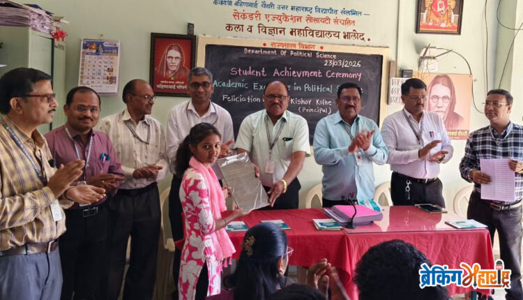 Honoring of Meritorious Students at Bhalod College भालोद, ता.यावल (24 मार्च 2026) : विद्यार्थ्यानी जिद्द चिकाटी आणि प्रामाणिकपणा अंगी बाळगला तर तो शैक्षणिक क्षेत्रात नक्कीच यशस्वी होतो किंबहुना यश त्याचा पाठलाग करते त्यामुळे विद्यार्थ्यांनी परीक्षेला सामोरे जाताना मी अभ्यास केला आहे मी परीक्षेत चांगल्या गुणांनी पास होणार आहे हा मंत्र बोलावा कॉपी मुक्त परीक्षा तुमच्या सारख्या अभ्यासू विद्यार्थ्यांमुळेच यशस्वी होते, असे प्रतिपादन भालोद महाविद्यालयाचे प्राचार्य प्रा.किशोर कोल्हे यांनी केले.