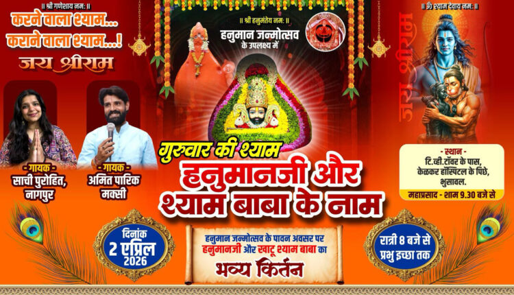 भुसावळ (1 एप्रिल 2026) : हनुमान जनोत्सवाचे औचित्य साधून शहरातील त्यागमूर्ती राजेंद्र दायमा प्रतिष्ठान व हम हैं श्याम के दिवाने मंडळातर्फे जामनेर रोडवरील टीव्ही टॉवरजवळील केळकर हॉस्पीटलजवळ कीर्तनाचे आयोजन करण्यात आले आहे. हनुमान व श्याम बाबाच्या नावाने आयोजित या कीर्तन सोहळ्यात गायक अमित पारिक मक्सी व साची पुरोहित (नागपूर) आपल्या सुश्राव्य वाणीतून कीर्तन सादर करणार आहेत. भुसावळकरांनी मोठ्या संख्येने उपस्थिती द्यावी, असे आवाहन आयोजकांनी केले आहे.