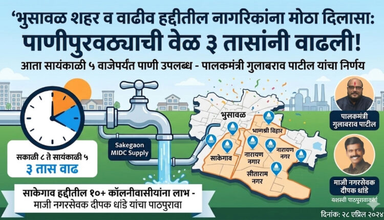 Relief for Residents in Bhusawal’s Extended Limits : Water Supply Duration Increased by Three Hours भुसावळ (28 एप्रिल 2026) : उन्हाळ्याची तीव्रता लक्षात घेता, साकेगाव हद्दीतील आणि भुसावळ शहराबाहेरील वाढीव परिसरातील नागरिकांसाठी राज्याचे पाणीपुरवठा व स्वच्छता मंत्री तथा पालकमंत्री गुलाबराव पाटील यांच्या सूचनेनंतर एमआयडीसी प्रशासनाने पाणीपुरवठ्याच्या वेळेत तीन तासांची वाढ केली आहे. आता सायंकाळी पाच वाजेपर्यंत पाणी उपलब्ध होणार आहे.