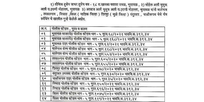 आरोपी तौफिकने दिलेल्या कबुलीनुसार भुसावळ बाजारपेठ पोलीस स्टेशन हद्दीतील दोन व भुसावळ शहर पोलिस स्टेशन हद्दीतील एक अशा एकुण तीनन गुन्ह्यांची कबुली दिली. आरोपींनी मालेगाव, लासलगाव, निफाड, सिन्नर (नाशिक जिल्हा), शिरपूर (धुळे जिल्हा), नंदुरबार, चाळीसगाव येथे चैन स्नॅचिंगचे गुन्हे साथीदार सोहेल अली युसूफ अली (इराणी मोहल्ला, भुसावळ) व अरबाज अली युसूफ अली (इराणी मोहल्ला, भुसावळ) हे पसार झाले.