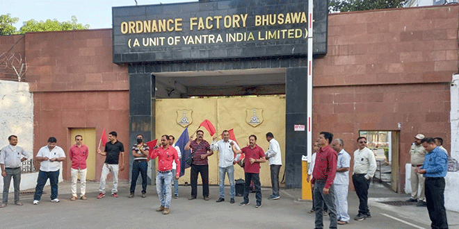 आयुध निर्माणीत कामगारांनी संपाला पाठिंबा देत निदर्शने केली.