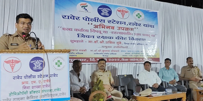 रावेर पोलिस स्टेशनतर्फे ‘चला कर्तव्य निभवू या’ जीवन रक्षक किट वितरण रावेर पोलिस स्टेशनच्या आवारात करण्यात आले. यावेळी रावेर शहरातील डॉक्टरांना जीवन रक्षक किट वाटप करण्यात आली. यावेळी डॉ.योगीता पाटील यांनी रस्ते अपघात जखमी झालेल्या रुग्णांवर तत्काळ उपचार केल्याने त्यांचा पोलिस अधीक्षक डॉ.प्रवीण मुंढे यांच्याहस्ते सत्कार करण्यात आला.