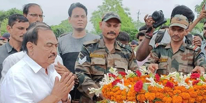 Burial of Veer Jawan in Nimkhedi in state honor मुक्ताईनगर : जम्मू काश्मिरातील उधमपूर येथे सैन्य दलात कार्यरत असलेल्या निमखेडीतील विपीन जनार्दन खर्चे (37) या तरुणाला कर्तव्यावर असताना वाहन दरीत कोसळल्याने वीर मरण आले होते. विपीन खर्चे हे निमखेडी बुद्रुक येथील भाचे आणि जावईदेखील असून मूळचे नेपानगर मध्यप्रदेश येथील रहिवासी आहेत. रविवार, 9 ऑगस्ट रोजी सकाळी वीर जवानाच्या मृतदेहावर शासकीय इतमामासह पोलीस विभागाने दिलेल्या मानवंदनेद्वारे अंत्यसंस्कार करण्यात आले.