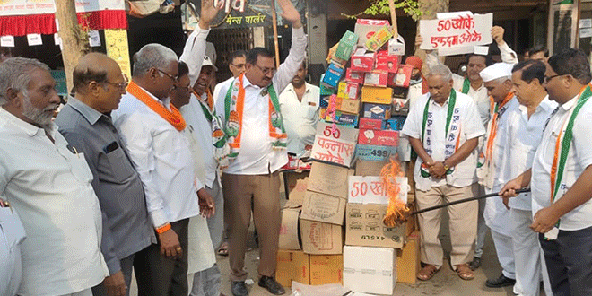 Burning of fifty boxes of Holi by Mahavikas Aghadi in Rawer City रावेर : पन्नास खोके एकदम ओकेच्या घोषणा देत महाविकास आघाडीतर्फे शिंदे सरकारच्या निषेध करीत रावेर शहरात पन्नास खोक्यांच्या होळीचे दहन सोमवारी करण्यात आले. रावेर शहरात महाविकास आघाडीतर्फे पन्नास खोके एकदम ओकेच्या घोषणा देत भाजपा व शिंदे गटाच्या सरकारचा निषेध करण्यात आला.