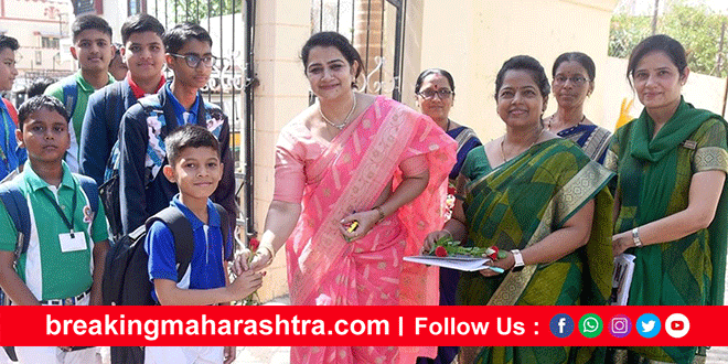 Welcoming students on the first day at Tapti Public School in Bhusawal city भुसावळ : शहरातील ताप्ती पब्लीक सीबीएसई इंग्लिश मिडियम स्कूलमध्ये पहिल्याच दिवशी सोमवारी शाळेतील इयत्ता नर्सरी ते दहावीच्या 90 टक्के विद्यार्थांनी शाळेत हजेरी लावली. विद्यार्थी सकाळी शाळेत येताच शाळेच्या प्रवेशद्वारा जवळ शाळेच्या प्रिंसीपल निना कटलर व शिक्षकांनी विद्यार्थ्यांचे गुलाबपुष्प व चॉकलेट देऊन स्वागत केले.