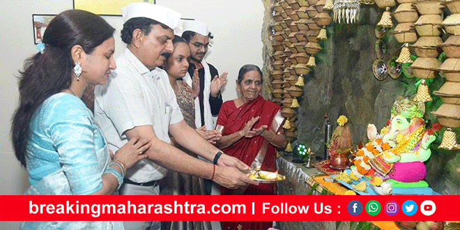 Bhusawal MLA Sanjay Savkare installation of eco-friendly Ganesha भुसावळ : भुसावळ तालुक्याचे आमदार संजय वामन सावकारे यांनी प्रोफेसर कॉलनीतील निवासस्थानी मंगळवारी पर्यावरणपूर्वक गणरायाच्या मूर्तीची स्थापना केली.