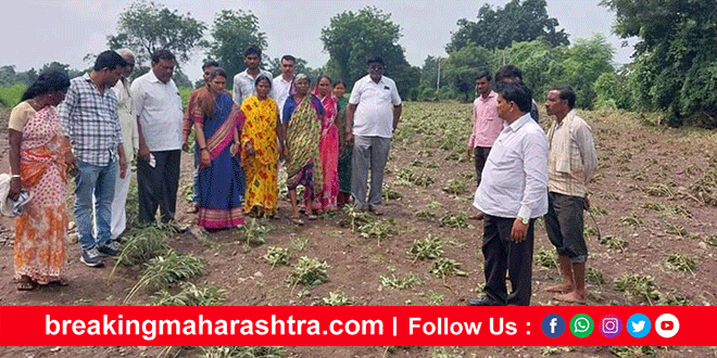 Damage to fields due to flood water in Kurha Area : Adv.Rohini Khadse inspected the damage मुक्ताईनगर : मुक्ताईनगर तालुक्यातील कुर्हा परीसरात शनिवारी रात्री झालेल्या मुसळधार पाऊसामुळे नदी नाल्यांना पूर आला आहे. पुराचे पाणी शेतांमध्ये शिरल्याने शेती पिकांचे मोठे नुकसान झाले. बोदवड, मोरझिरा, धामणगाव येथे पुराच्या पाणी शेतात शिरल्याने शेतजजमिनीसह पिके वाहिली आहेत. बोदवड येथे बोदवड ते पूर्णा नदी या सार्वजनिक बांधकाम विभागाच्या अखत्यारीत असलेल्या रस्त्यावरील नाल्याचे पाणी नाल्याचा प्रवाह सोडून बाजुच्या शेतात शिरल्याने पिके वाहून गेल्याने शेतकर्यांचे मोठया प्रमाणावर नुकसान झाले आहे