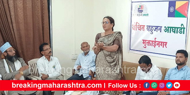 Mot should be built to strengthen the party : Shamibha Patil मुक्ताईनगर ः कार्यकर्ता हा पक्षाचा कणा असून प्रत्येक कार्यकर्त्याने पक्ष बळकटीसाठी मोट बांधावी तरच विजयी राजकारणाकडे वाटचाल होईल त्यासाठी प्रत्येकाने नैतीक जबाबदारी स्वीकारण्याची गरज आहे, असे प्रतिपादन वंचित बहुजन आघाडीच्या नवनिर्वाचित जिल्हाध्यक्षा शमीभा पाटील यांनी मुक्ताईनगर येथे केले. जिल्हाध्यक्षपदी निवड झाल्यानंतर त्यांनी पहिल्यांदाच मुक्ताईनगर येथे पक्ष बळकटी करणासंदर्भात व आगामी निवडणुकांच्या पार्श्वभूमीवर पक्ष मजबुत करण्याबाबत कार्यकर्त्यांची बैठक घेतली. अध्यक्षस्थानी वंचित बहुजन आघाडीचे मुक्ताईनगर तालुकाध्यक्ष दिलीप पोहेकर होते.