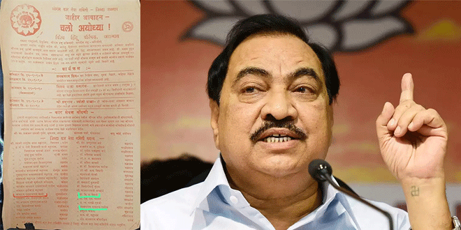 आमदार एकनाथराव खडसे यांनी 1990 मधील एक पत्रिका दाखवली आहे. त्यात आमदार एकनाथ खडसे असा नाथाभाऊंचा उल्लेख आहे. या पत्रिकेत जळगाव जिल्ह्यातील कारसेवकांची नावे आहेत. त्यात नाथाभाऊंचं नाव आहे. देवेंद्र फडणवीस यांनी ट्विटरवर कारसेवला जात असतानाच फोटो टाकताच खडसेंकडूनही कारसेवक म्हणून उल्लेख असलेली पत्रिका व्हायरल करण्यात आली आहे.