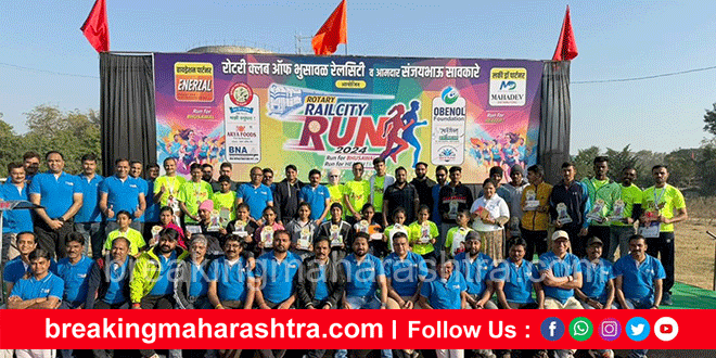 750 Bhusawalkars ran in Railcity Run in Bhusawal भुसावळ : रोटरी क्लब ऑफ भुसावळ रेलसिटी व आमदार संजय सावकारे आयोजित रोटरी रेलसिटी रन या मॅरेथॉन स्पर्धेत 750 पेक्षा अधिक भुसावळकरांनी सहभाग नोंदवून पर्यावरण व निरामय आरोग्याचा संदेश दिला. मॅरेथॉनमध्ये पाच वर्षीय बालकापासून 75 वर्षीय ज्येष्ठ नागरीकांपर्यंतच्या विविध वयोगटातील स्पर्धकांनी सहभाग नोंदवला. मॅरेथॉन मार्गावर ठिकठिकाणी पुष्प उधळण आणि ढोल ताशांचा गजर करण्यात आला.