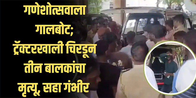 Three children killed near Dhule after being crushed by an uncontrolled tractor: six injured धुळे (18 सप्टेंबर 2024) : विघ्नहर्त्या गणरायाला सर्वत्र भक्तीभावाने निरोप दिला जात असताना धुळ्यानजीकच्या चितोडमध्ये मात्र अनियंत्रीत ट्रॅक्टरने गर्दीतील तिघांचा चिरडल्याने मृत्यू झाला तर सहा जण जखमी झाले. ही धक्कादायक घटना मंगळवार, 17 रोजी घडली. या अपघातामुळे गावात गोंधळ उडाला. जखमींना त्वरीत धुळ्यातील भाऊसाहेब हिरे शासकीय वैद्यकीय महाविद्यालयाच्या सर्वोपचार रुग्णालयात हलविण्यात आले.