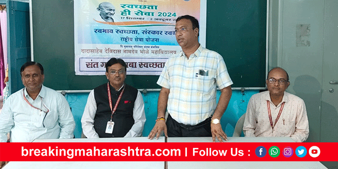 भुसावळ (29 सप्टेंबर 2024) : कवियित्री बहिणाबाई चौधरी उत्तर महाराष्ट्र विद्यापीठ, जळगाव व दादासाहेब देविदास नामदेव भोळे महाविद्यालयाच्या संयुक्त विद्यमाने स्वच्छता ही सेवा 2024 स्वभाव स्वच्छता संस्कार स्वच्छता या कार्यक्रमांतर्गत संत गाडगेबाबा स्वच्छता अभियान महाविद्यालय राबवण्यात आले.