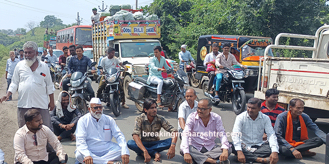 शेतकरी संघर्ष समितीचे अध्यक्ष सुरेश पाटील यांच्या नेतृत्वाखाली येथील नवीन विश्रामगृहात जवळ शुक्रवारी रस्ता रोको आंदोलन करण्यात आले. रस्त्याच्या दुतर्फा सुमारे एक ते दीड किलोमीटर वाहनांच्या रांगा लागल्या होत्या. यावेळी आंदोलनकर्त्यांनी बांधकाम विभागाच्या विरोधात जोरदार घोषणाबाजी केली. सुमारे अर्धा ते पाऊण तास आंदोलन चालले.